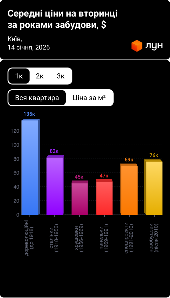 Цей фактор добре помітний і на вторинному ринку. За даними ЛУН, квартири в хрущовках і панельних будинках у середньому коштують дешевше, ніж у новішій забудові — ринок враховує майбутні витрати на утримання й модернізацію.
