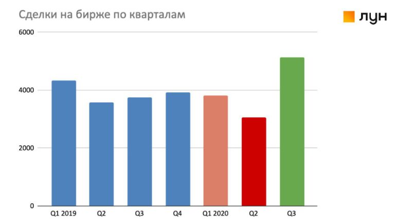 Такая же картина наблюдается согласно данным ЛУН.юа по сделкам покупки первички через биржу: если в первом квартале количество сделок было зафиксировано ниже аналогичного периода прошлого года, еще большее снижение – во втором квартале, то в третьем квартале – рекордные показатели и мы понимаем, что к этому привел отложенный спрос периода карантина.
