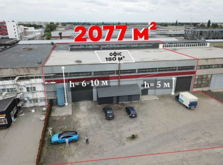 Будівля має загальну площу понад 2 тис. кв. м, з яких близько 180 кв. м займає офіс. Висота стелі сягає 10 м, воріт — 5 м, що дозволяє працювати з великогабаритним транспортом. На території є власна парковка на понад 12 місць, можливість розвороту TIR, рівна підлога й опція облаштування рампи.