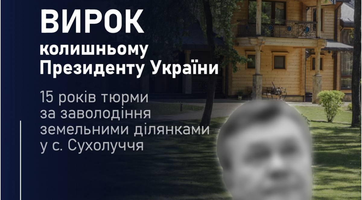 Вироком суду експрезидента визнано винуватим у заволодінні земельною ділянкою лісового фонду на території Сухолуцької сільради на Київщині площею 17,5 га та орієнтовною вартістю понад 22 млн грн, тобто у вчиненні злочину, передбаченого ч. 5 ст. 191 КК України, та призначено покарання у вигляді 15 років позбавлення волі з позбавленням права обіймати посади в органах державної влади та місцевого самоврядування, посади в органах, установах і організаціях, повʼязаних з виконанням організаційно-розпорядчих чи адміністративно-господарських функцій, або виконувати такі функції за спеціальним повноваженням строком на три роки, з конфіскацією усього належного йому на праві власності майна.