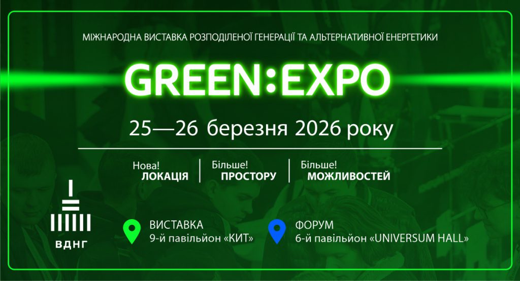 25-26 березня 2026 року у Києві (ВДНГ, 9 павільйон «КИТ»,  пр-т Академіка Глушкова, 1) відбудеться виставка, присвячена розподіленій генерації та альтернативній енергетиці — GREEN:EXPO