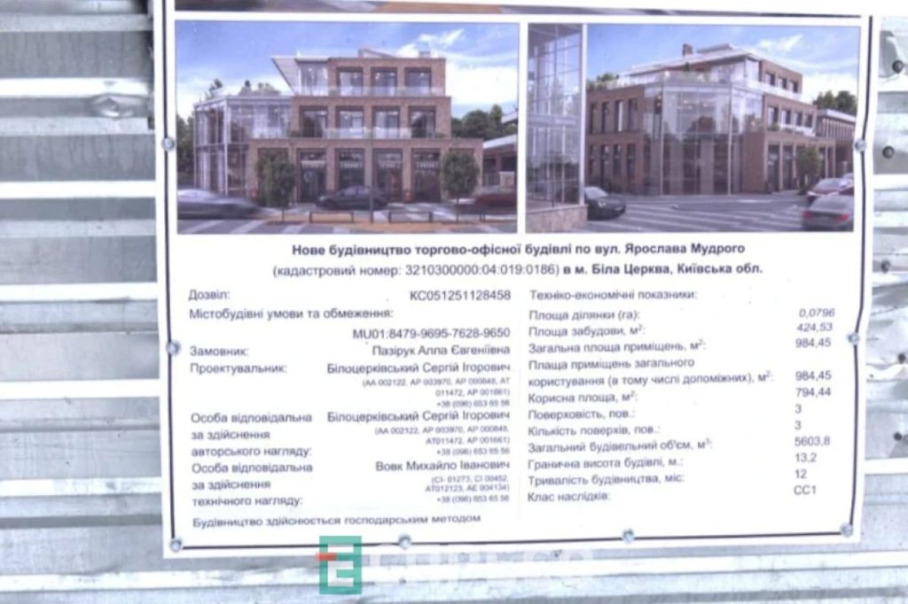 За паспортом об’єкта, будівля матиме висоту 13 м та площу 991,3 кв. м. Замовницею виступає Алла Пазірук, а проектуванням займається Сергій Білоцерківський, керівник ТОВ «Володарський ВКБ», розмір статутного капіталу якого становить понад 18 тис. грн.