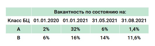 Активизация спроса на аренду с середины февраля 2021 года позволила снизить вакантность в БЦ класса «А» к концу августа до 1,4%.