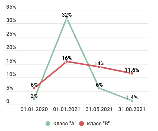 Рис. 3 Соотношение вакантной площади к общей арендной площади в БЦ класса А и В по состоянию на 01.09.2021