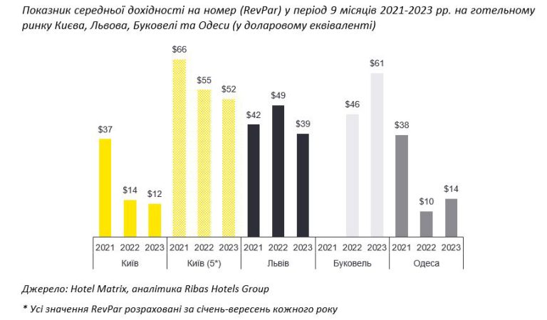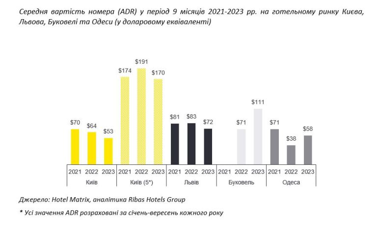 «На фоні зниження попиту на засоби розміщення в Києві в 2022-2023 роках показник середньої вартості номера (тут і надалі — ADR) та відповідно середньої дохідності на номер (RevPar) мав тенденцію до зниження в порівнянні з показниками 2021 р. За підсумками 1-3 кв. 2023 р. середньорічний показник ADR в функціонуючих готелях Києва становив близько $53 (проти ~$70 в 2021 р.), а RevPar — $12 (проти $37). Втім, це не стосується п’ятизіркових готелів Києва, більшість яких працюють під міжнародним брендом, які як правило за своїми внутрішніми політиками та стратегією є менш гнучкими та тримають вартість номера у відповідності до інших готелів мережі по всьому світу. В таких готелях ADR за 9 місяців 2023 р. склав близько $170, що в цілому несуттєво менше за показник аналогічного періоду 2021 р.